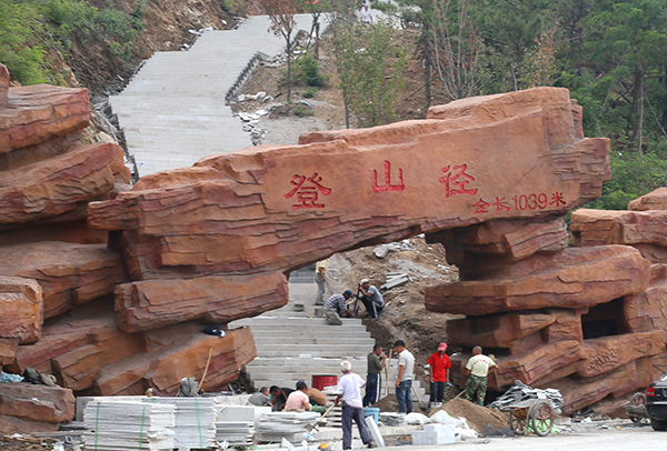 通往觀景臺的是一條長達(dá)1039米的登山徑,登山徑自下而上觀望,給人以高聳入云之感,登山徑的主體現(xiàn)已完工,但在現(xiàn)場依然還能看到一群手持精密儀器的測量人員和工程技術(shù)人員一直在這里認(rèn)真工作。他們是為了登山徑兩側(cè)的排水工程、電氣工程及綠化裝飾工程做著最后的測量,以確保工程質(zhì)量。