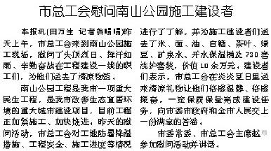 本報訊(田萬生記者魯暘暘)昨天上午,市總工會來到南山公園施工現(xiàn)場,慰問了頭頂烈日、揮汗如雨、辛勤奮戰(zhàn)在工程建設(shè)一線的職工們,為他們送去了清涼物資。