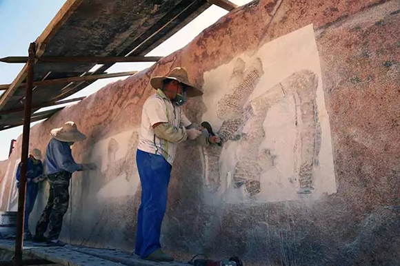 在南山公園主山門廣場內(nèi)一塊巨石異常顯眼,這是該廣場一塊重要的景觀置石。今天上午,記者見到工人們正在石體上打磨刻字,“南山公園”四個(gè)大字已經(jīng)清晰可見。